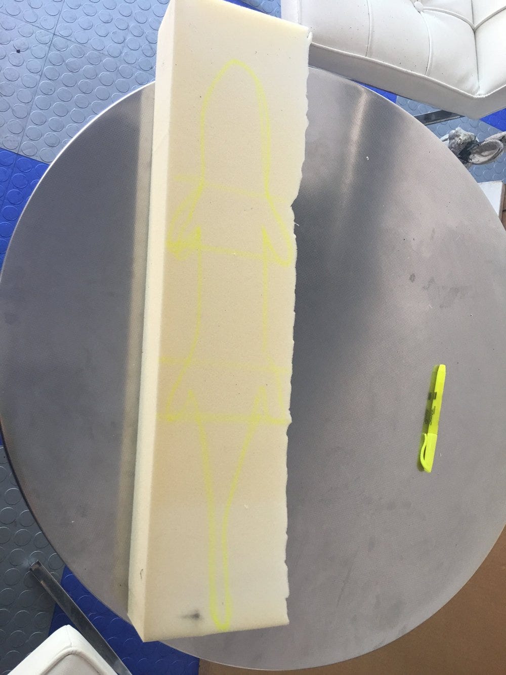 With a yellow highlighter like the first puppet class trio from Stan Winston School, I drew a test drawing of what I wanted my green anole to look like. The shape wasn’t the final design measurements–that’s OK.