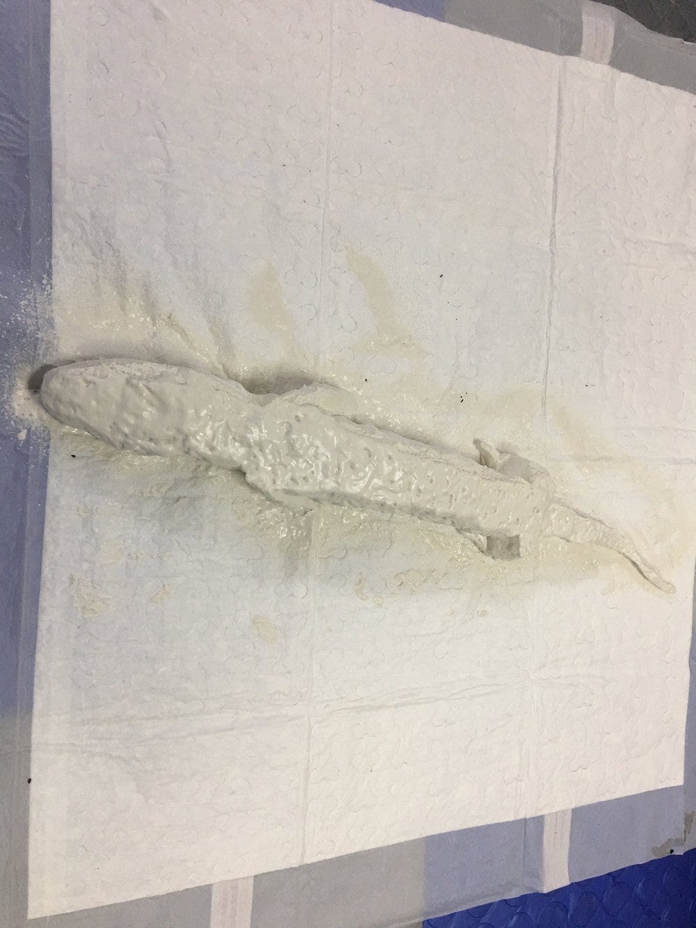 The Stan Winston class offerings later on do include molding and casting. The Garage Monsters classes are your first introduction to that. In my studying right now, I am not ready to go down to the store buying all kinds of casting supplies until I know I am ready to work more with it in constant classes and/or stop motion needs. What I did instead: substitute Homax Wall Texture from the hardware store for a quick DIY scale effect. The product naturally creates a scaly texture I made have cracks and designs in it with a plastic knife and pressing down the pattern from a puppy wee wee training pad.