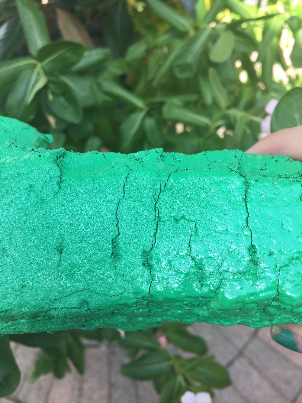 And now, a zoom in on the final lizard-y skin! The wall texture spray was an unexpected smashing success. His midriff sides have a nice roughed up look like a pet shop lizard. The upper cracks dried very authentic for a foam puppet. Were I working on a big budget lizard/dinosaur movie FX team, I would ask my boss for permission to use the wall texture spray seeking advice from him/her on how I could improve on it for scaly closeups with better scale carving tools or pattern stamping. Think of the time you would save on production and costs paying for products and staff members’ work days.