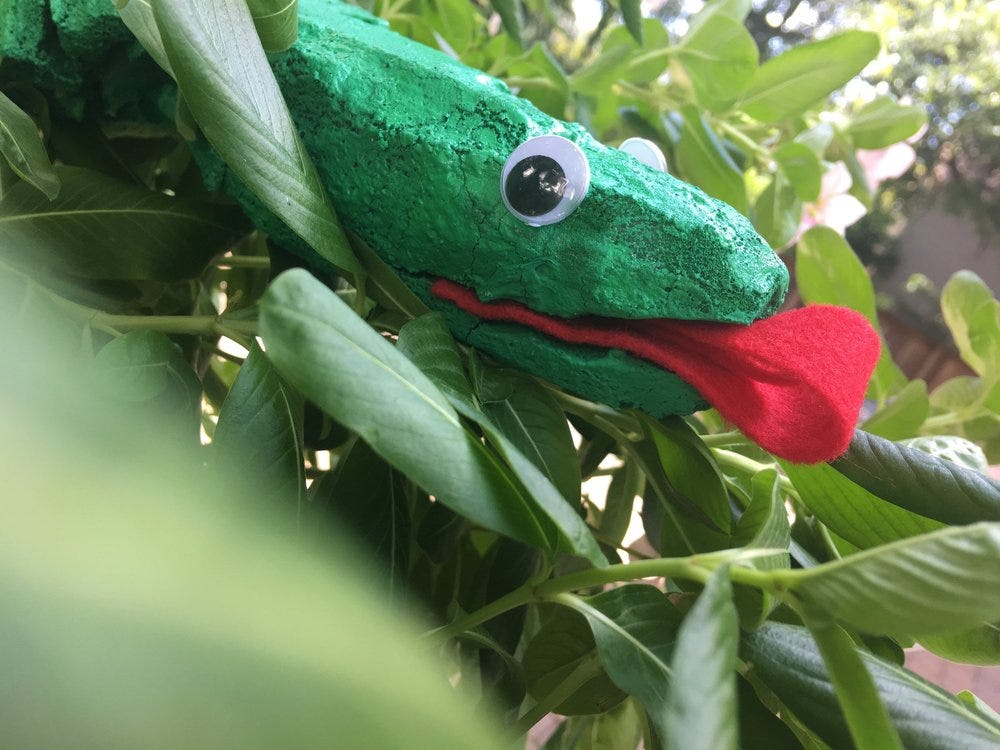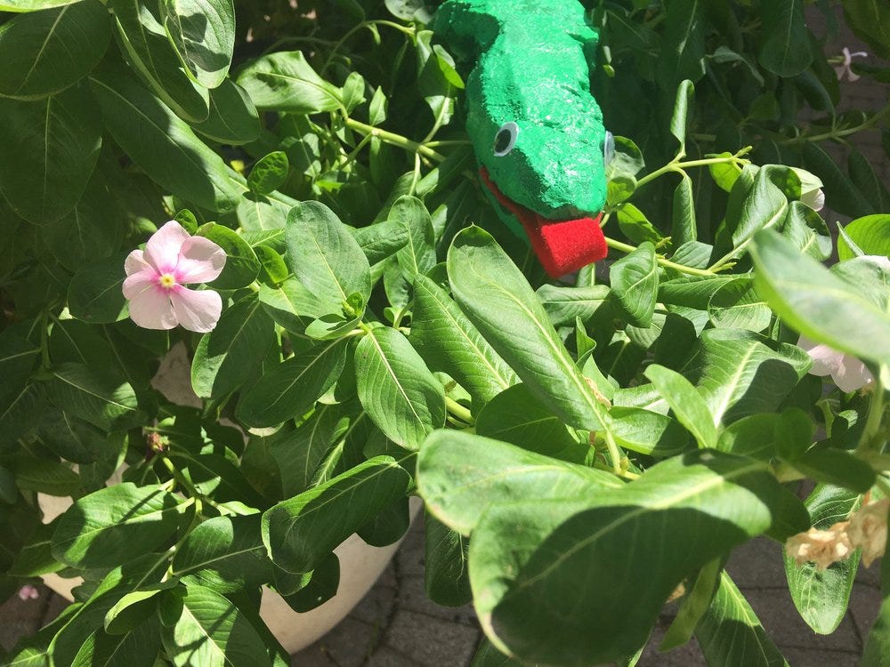 My lizard has a yellow stomach and toes with a 90 percent green body. His yellow was the same can of yellow I have been using on other puppets. His green paint was a standard green spray paint. From there, I glued on a rolled up tongue and eyes. Garage monsters don’t need to be scary. Your fav kawaii cartoon characters themselves are monsters! My guy is ridiculous looking. Certainly not one to make a Jurassic Park T-Rex tremble.