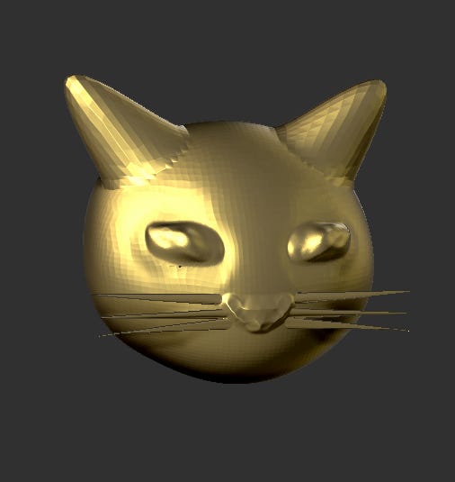 My 3D face sculpture of Sheila, ready for ancient Egypt. Sheila’s eye structure is a bit slanted, her head shape very rounded. Were I to pop this into an animated film, we could paint over it to get the full super Sheila markings pattern.