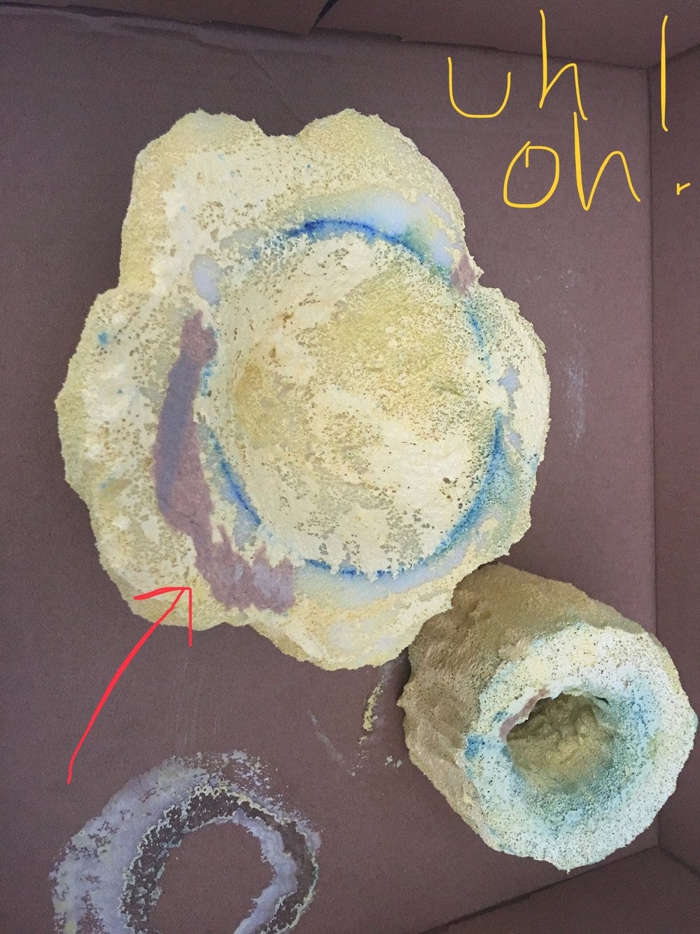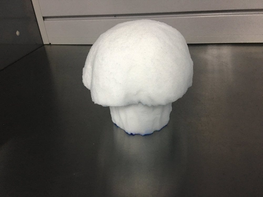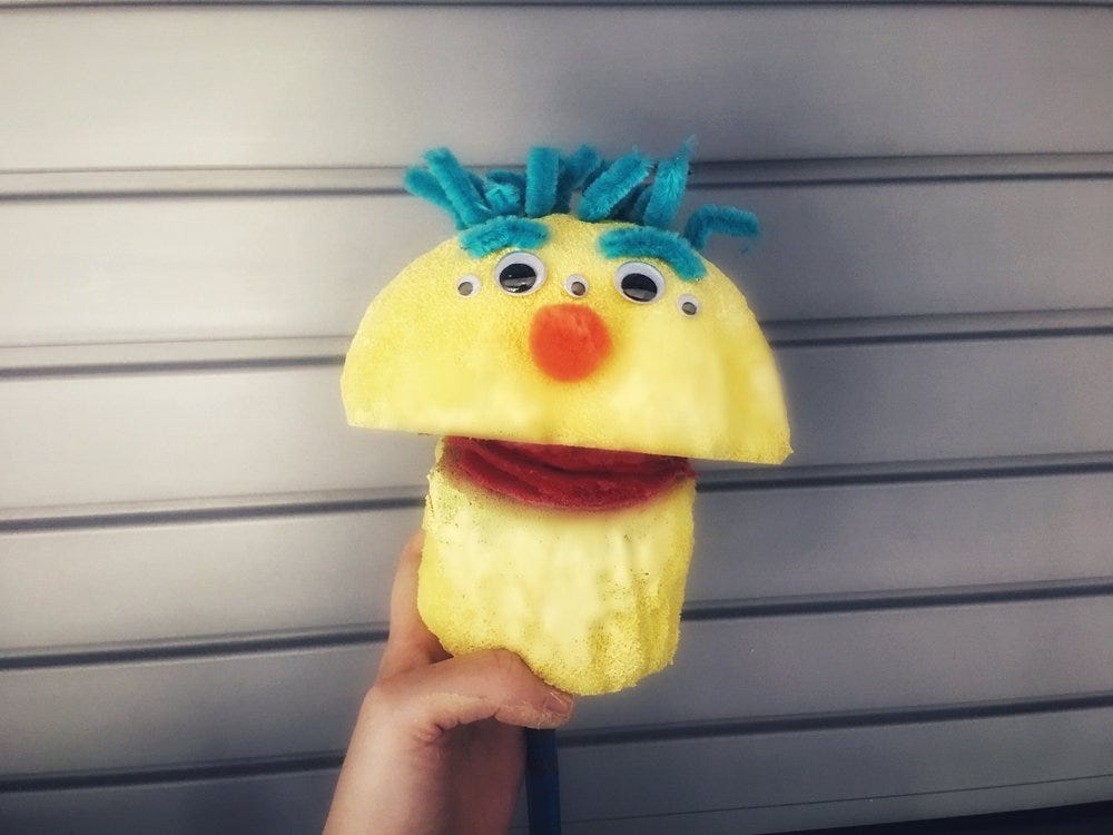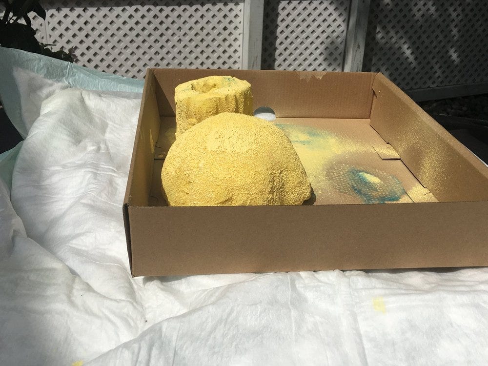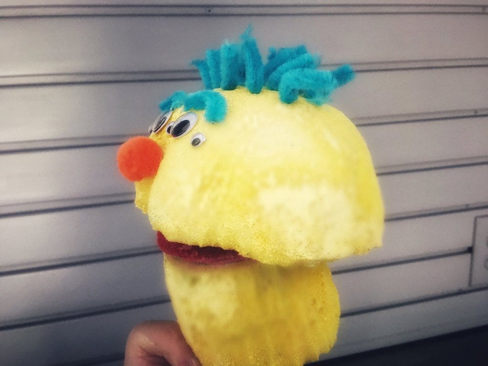 My spray paint needed less for sure. OK, sorry. I was unaware my foam wouldn’t absorb all of it as intended. The dude came off slightly tie dyed. Give me credit for my creativity and muffin shaping! First puppet ever!