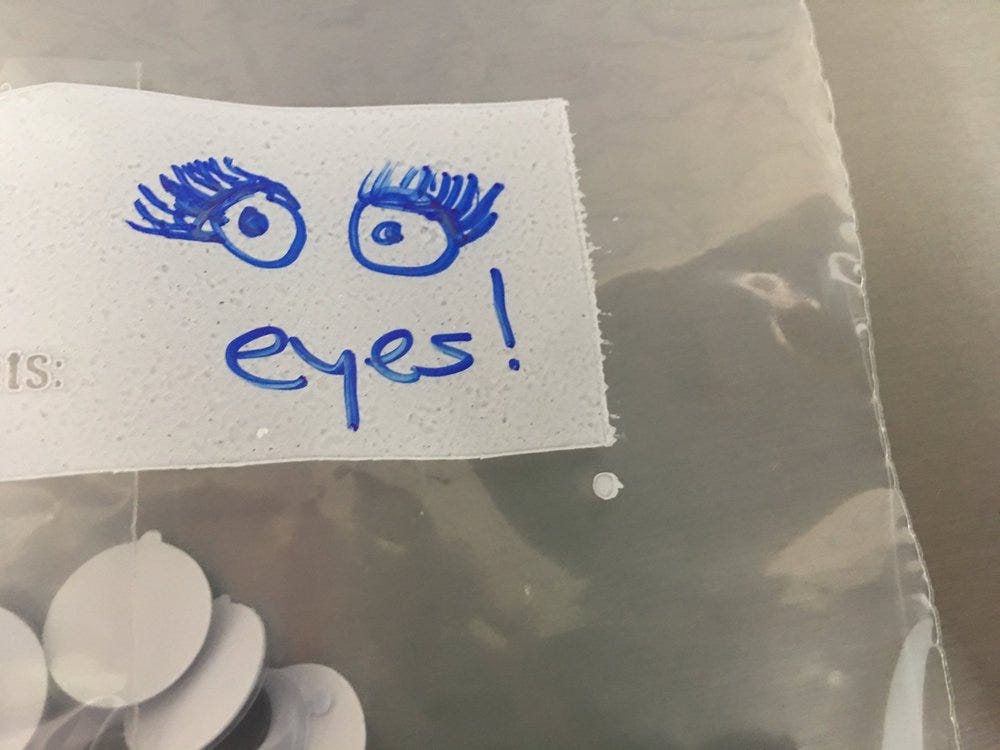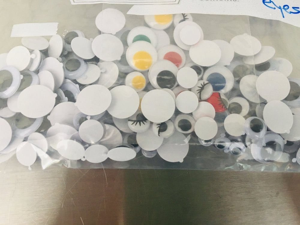 Some eyeballs out of my new operating room as a black market ophthalmologist, I mean, bag filled with newly bought craft eyes, gave the muffin a cute expression and far superior vision to my own eyesight. Indeed! Like my muse, Ryan Reynolds, my muffin puppet has a handsome smile, spiky hairdo, and five eyeballs.