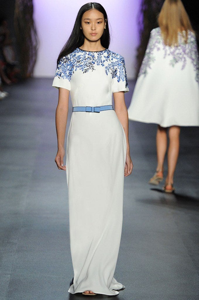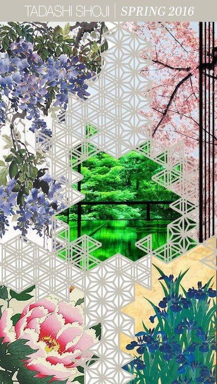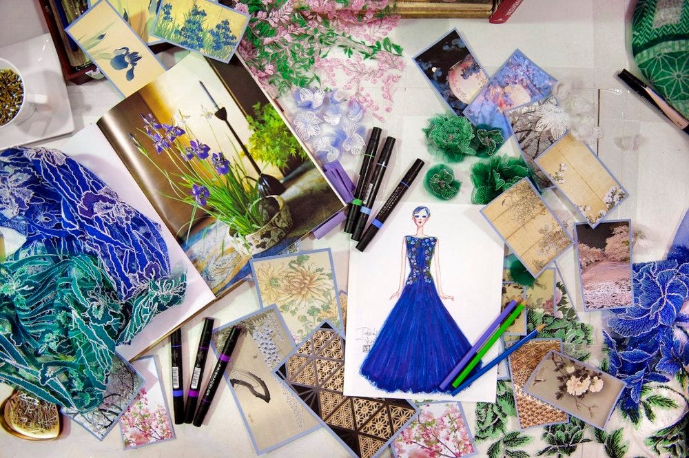 My roots are in Japan so I will always have an affinity for the culture and my heritage. This spring, I turned to meditative Japanese gardens and found inspiration by the beautiful flowers including the peonies, cherry blossoms, and wisteria. I was also inspired by legendary Japanese artists Ogata Korin and Katsushika Hokusai. Their use of color and their detail in capturing nature can be found throughout my designs.