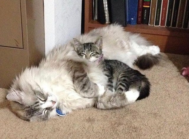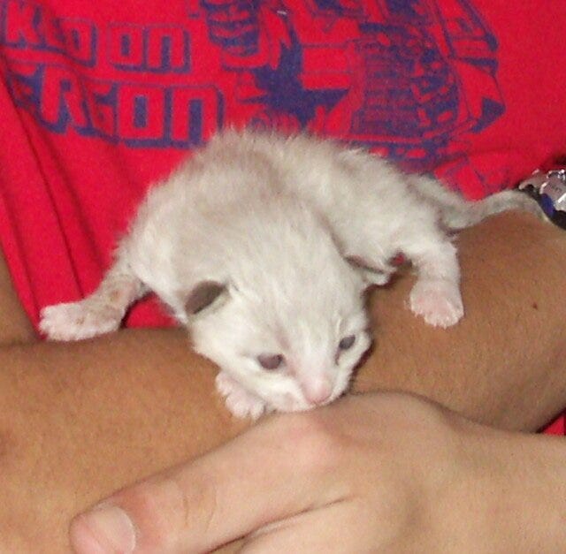 As an adult, I enlisted in the Navy and had to take a few years off from rescuing due to my deployment schedule. It wouldn’t have been fair for me to rescue or foster during a time of so much change. However, near the end of my enlistment, a serendipitous event occurred which brought me face to face with my next fur child. I had a couple of months left in the Navy and was finishing up shore duty, knowing I wouldn’t likely be deployed again before I separated. I decided to sell my car because I knew I would be moving to Los Angeles. I listed my car online and waited patiently for a reply. As luck would have it, the first inquiry I received was from a lovely young woman a few towns over from the base. She was interested in my car but wanted to ask me an animal question just on the off chance that I might be able to help. Turns out, not only could I help, but I was gifted with caring for my first neonate rescue kitten. When she appeared at my door she carried a small basket with the tiniest neonate in tow. He was the smallest kitten I had ever seen, weighing in at just one ounce. His rescuer had waited for an entire day for a mother to come back as this sweet little soul mewed from her lawn. She hated the idea of leaving him out there but also understood that being with his mom would be the best thing for him. The mother never returned. His rescuer knew right away that she did not have the skills or resources needed to care for a kitten so young. She explained that something in her heart motivated her to tell me (a total stranger) about the kitten she had rescued. To this day I feel that the universe wanted me to care for this cat. She got the car and I got Wally, my soul kitty. Wally has been a constant companion through some of the most difficult times of my life, and an amazing surrogate cat dad to the countless kittens that have come through my door. Every time I welcome a new forster to my home, Wally acts as the welcoming committee. He grooms them, makes sure they get the lay of the land, he shows them the litter box, when food time is...I couldn't ask for a more loving fur kid. He has taught many a kitten how to cat and is just as much a part of socializing our fosters as I am.